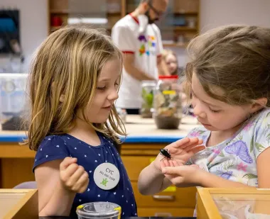 After a month-long study of insects, the children were eager to handle creepy-crawlies in the Plant Sciences Building. A leopard grasshopper, vividly red and yellow, was “tickly and sticky,” said one brave tot. Black Bess beetles, the size of a large paperclip, wandered from tiny hand to tiny hand. “He loves you, I think,” said Abigail Lynn to Nora Hurst.