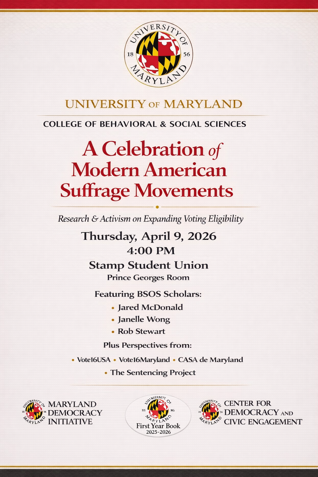 An Exploration of Modern American Suffrage Movements will feature researchers and activists working to understand movements to expand voting rights to residents of the United States who are under 18, lack citizenship status, or have had voting stripped because of felony status. Maryland has become a key state for organizing and innovation in these movements because the Maryland state constitution grants cities and towns extraordinary control over both voter eligibility and election administration for municipal elections. Our program will feature research from BSOS Scholars Jared McDonald, Janelle Wong, and Rob Stewart who are at the forefront of efforts to understand these movements. It also will feature perspectives from activists affiliated with Vote16USA, Vote16Maryland, CASA de Maryland, and the Sentencing Project. A brief reception will follow the forum. This event is organized by the College of Behavioral and Social Sciences, Center for Democracy and Civic Engagement, Maryland Democracy Initiative, and First Year Book Initiative.