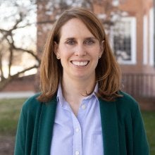 Dr. Margaret walton headshot. Dr. Walton is wearing a green cardigan with a blue button up shirt. The picture is taken outside of the college of education building in front of a cherry blossom tree